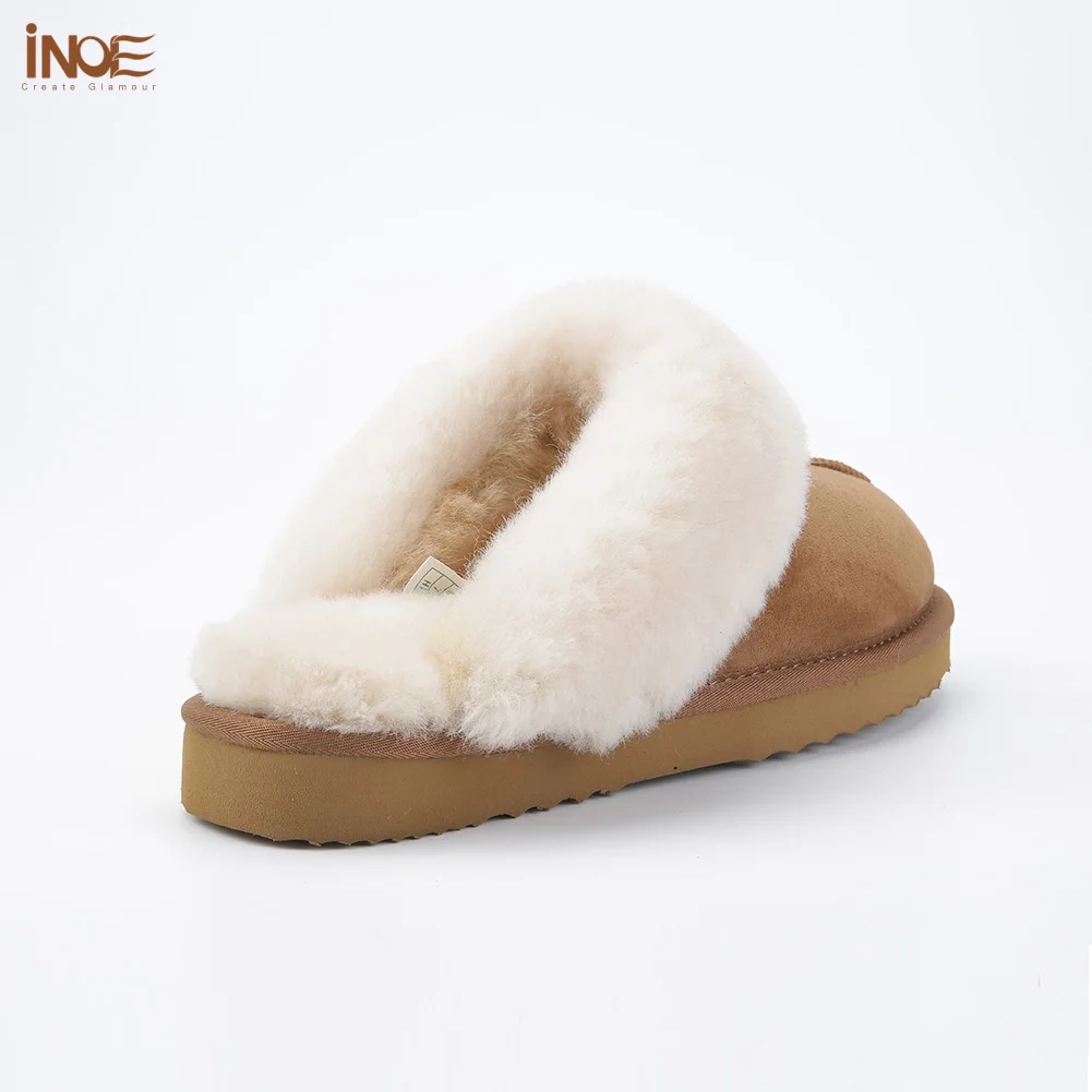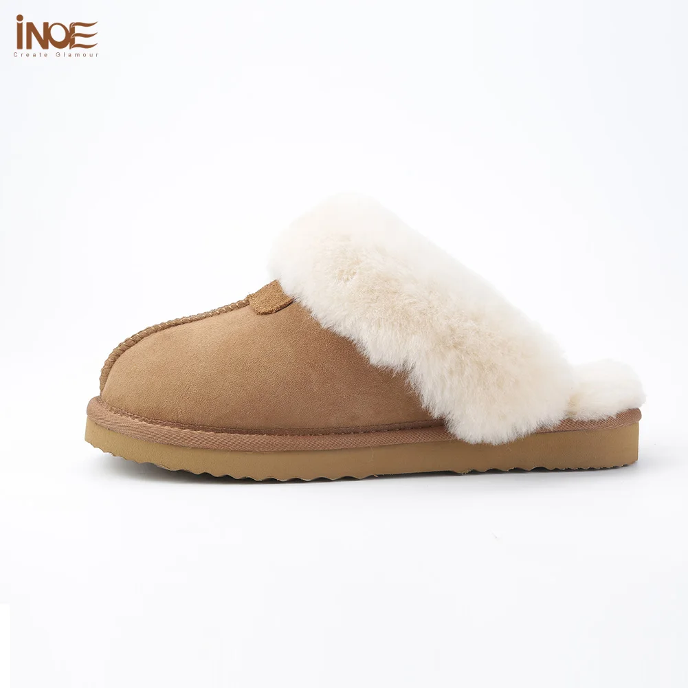 INOE Sheepskin Suede Leather Natural Fur Lined Women Winter Slippers Home Shoes Indoor House Shoes